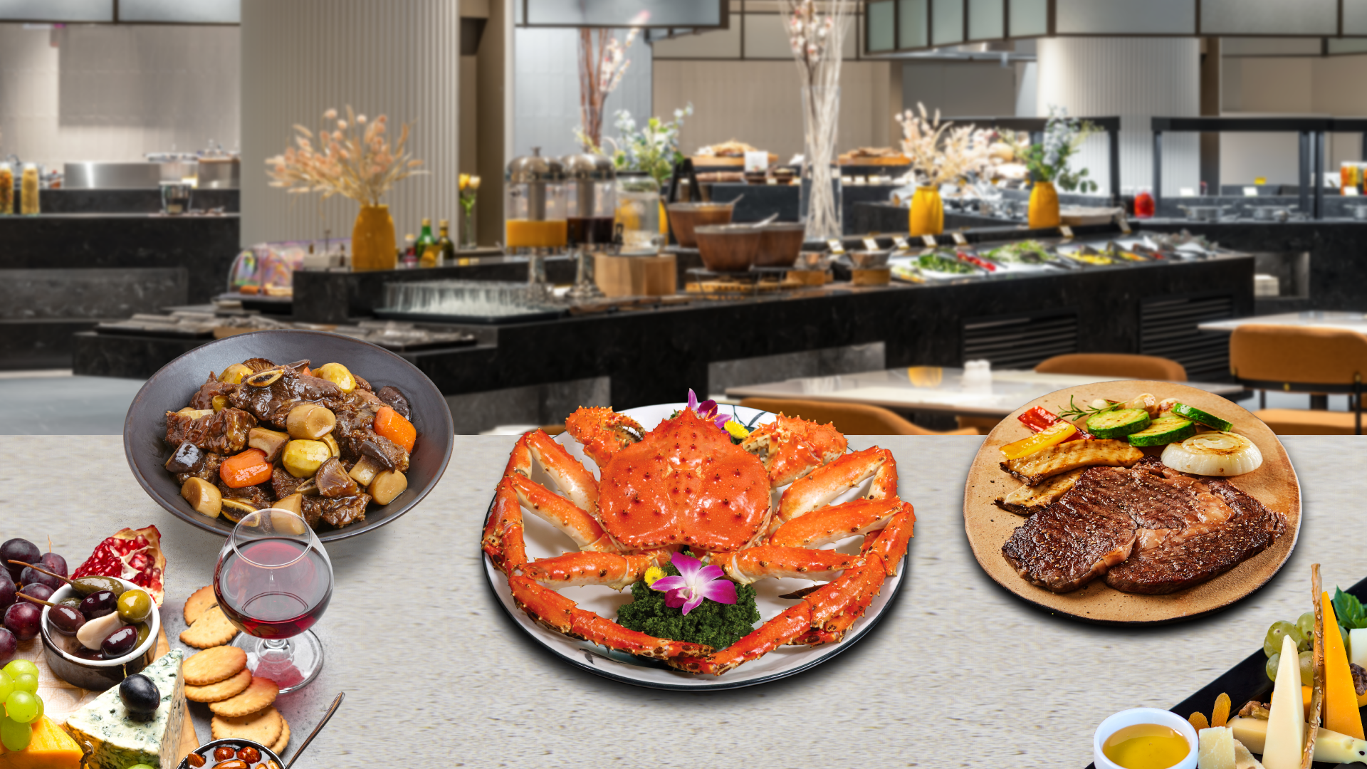 🦀 킹크랩, LA갈비, 등심스테이크, 전복버터구이 등 100여 가지 프리미엄 메뉴